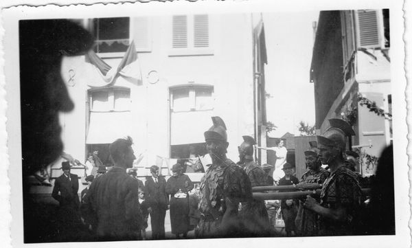 Il semble que le personnage au centre soit Pierre PECQUET, costumé en soldat romain. Il avait participé avec les anciens de l’école St-Martin d’Amiens à d’importantes festivités organisées à ABBEVILLE le 15/08/1938. Abbeville célébra ce jour le 300ème anniversaire du vœu prononcé par LOUIS XIII.